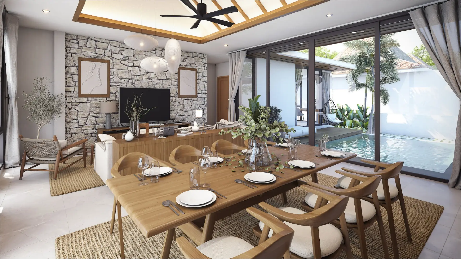 The villa features an expansive open plan living room and modern kitchen framed by stunning high ceilings. The bedrooms feature ample space, walk in closets, ensuite bathrooms and direct pool access. Designed with the Phuket climate in mind, our properties are built to be energy-efficient and eco-friendly. As you walk out onto the patio, you are greeted by a beautiful garden space for relaxation and restoration.